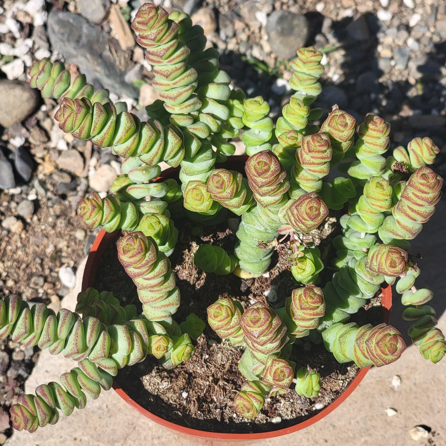 Crassula perforata es una suculenta de aspecto impresionante que es ideal para principiantes. Viene en distintos tonos de verde, azul, gris y rosa. Las hojas gruesas y triangulares giran alrededor del tallo.