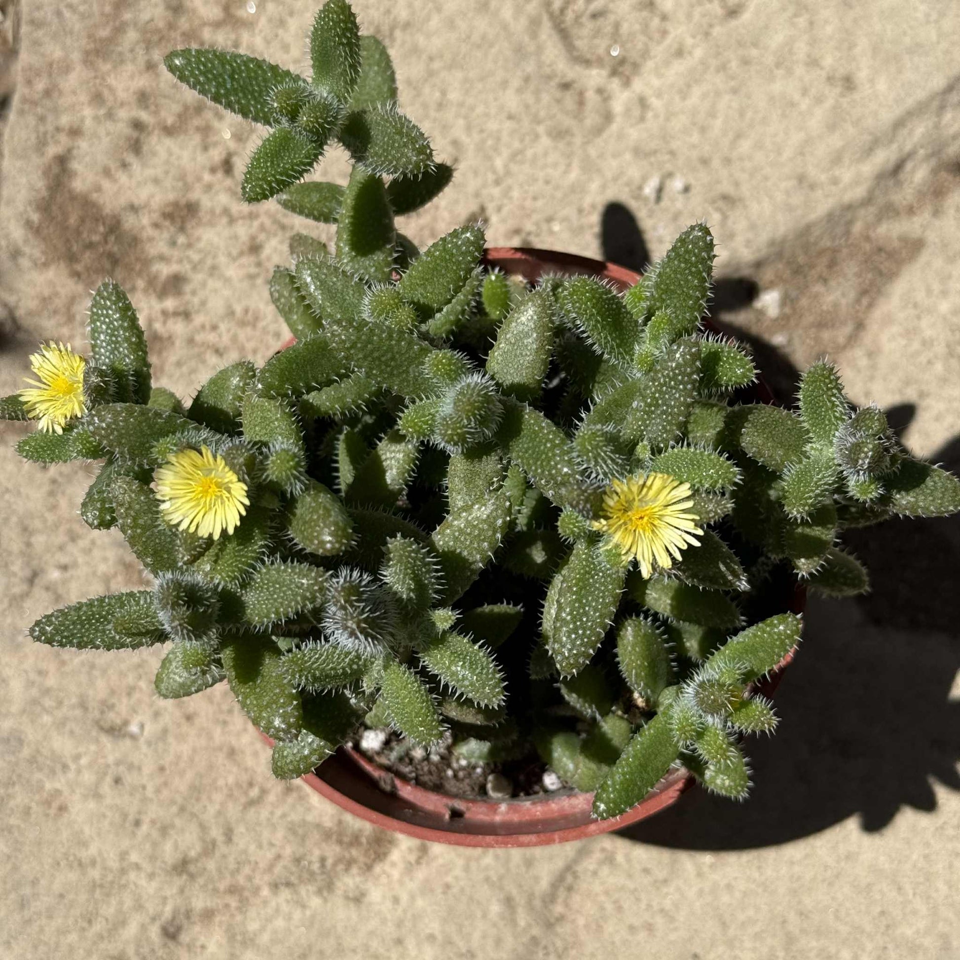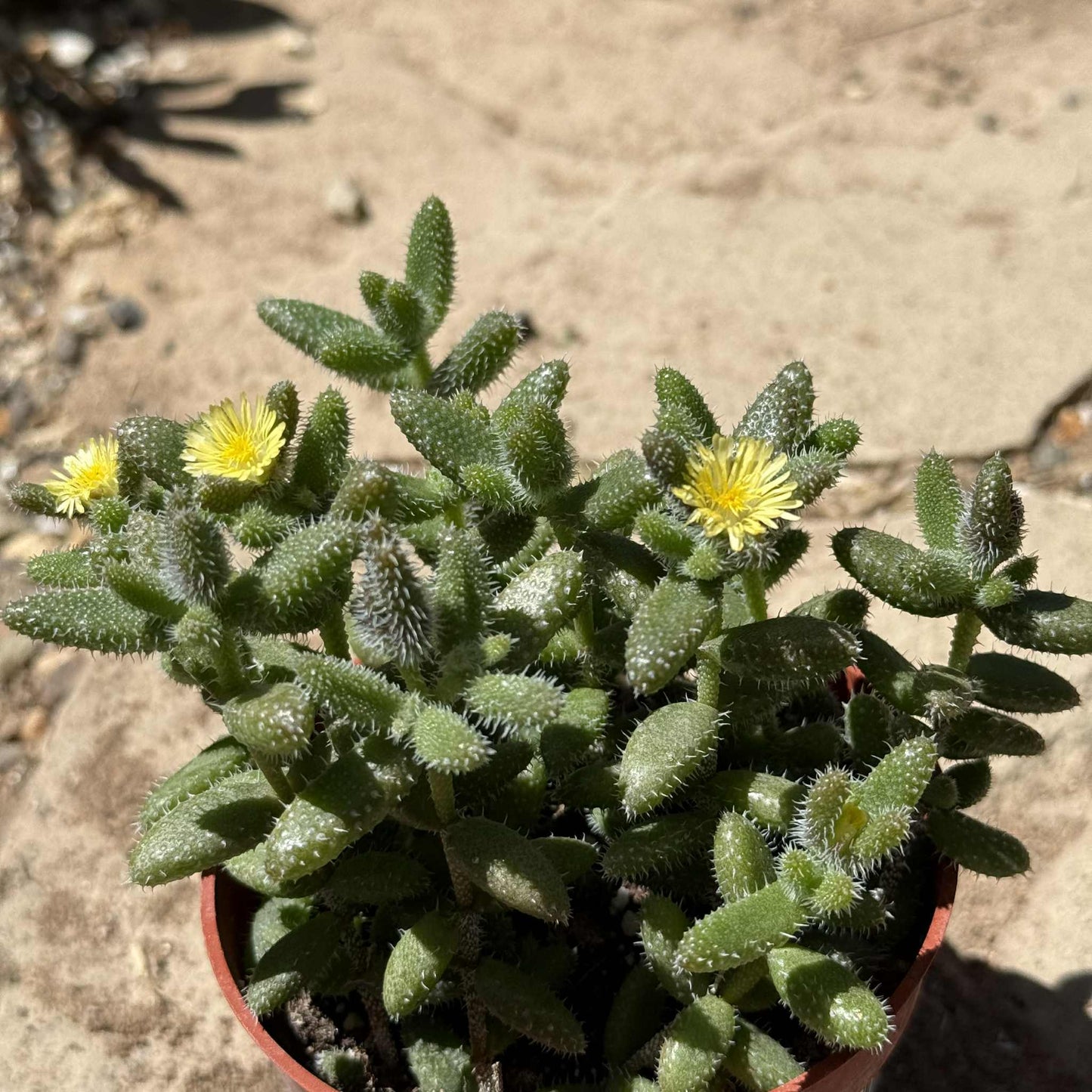 Planta de pepinillo (Delosperma echinatum): una planta única con hojas de aspecto espinoso cubiertas de pequeños pelos blancos translúcidos. Es originaria de Sudáfrica y generalmente se extiende como una estera en hábitats rocosos. Sus tallos estrechos pueden crecer hasta 18,0" de largo. Florece con pequeñas flores de color amarillo pálido.