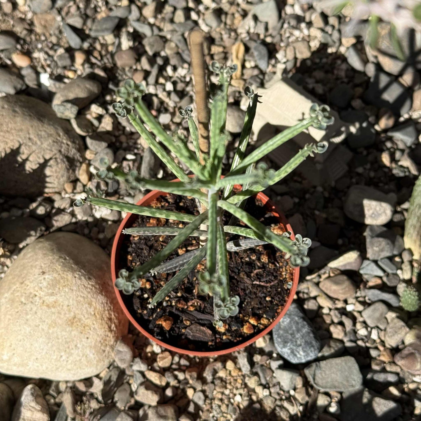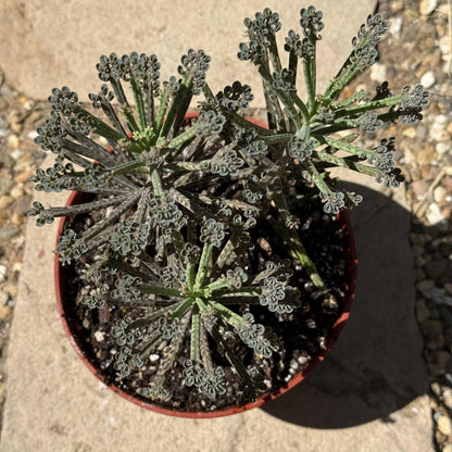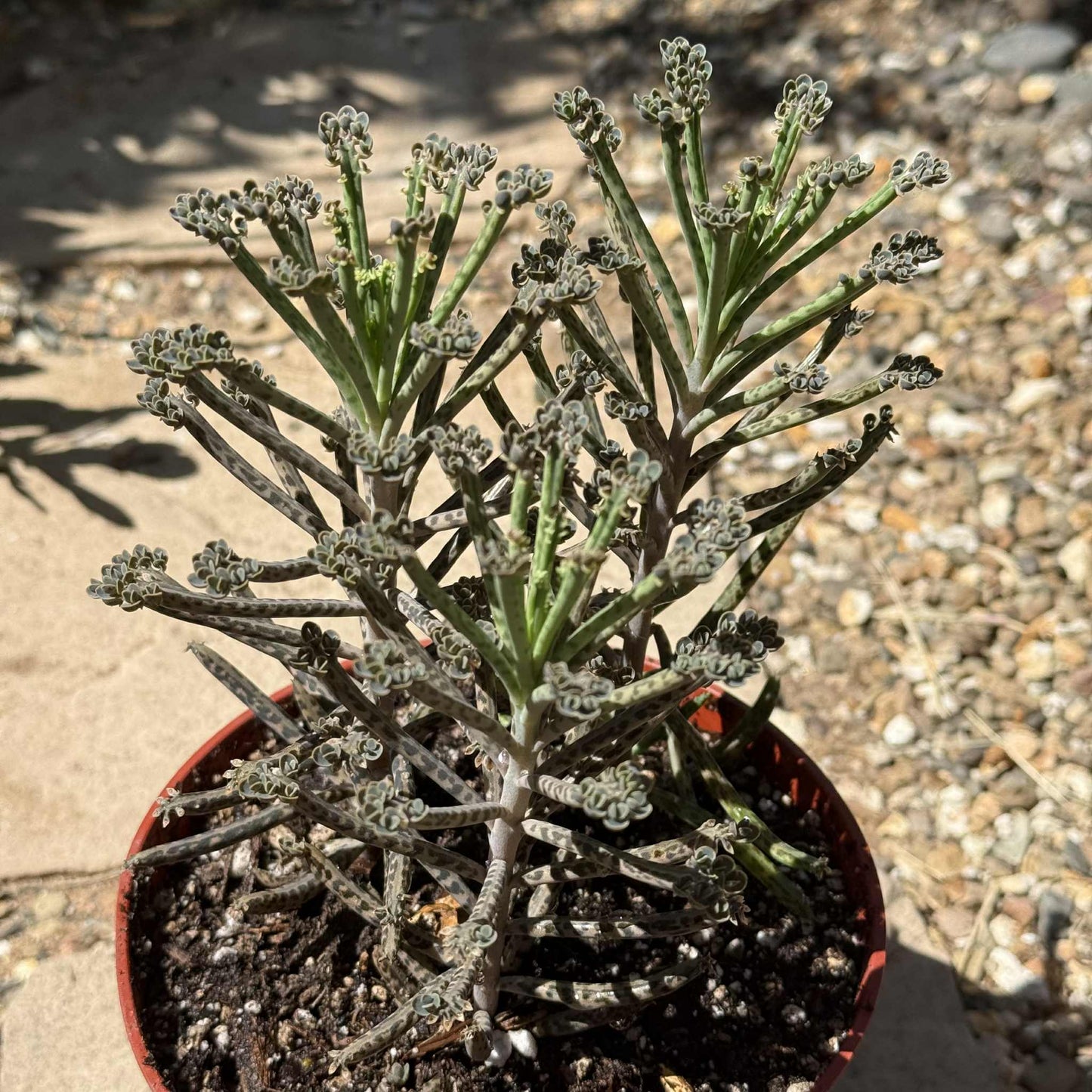 Kalanchoe tubiflora, also known as Mother of Thousands, Chandelier Plant, or Bryophyllum delagoense, is a striking succulent known for its tall, tubular leaves and prolific propagation habits. The slender, gray-green leaves are adorned with small plantlets along the edges, which readily drop off and root, giving the plant its nickname. These upright leaves often develop dark spots or tinges of purple, especially in bright sunlight. As it matures, Kalanchoe tubiflora can reach up to 3 feet tall and may produce tubular orange to reddish flowers on tall stalks, adding to its visual interest. This plant is extremely hardy and drought-tolerant but can become invasive in some regions due to its rapid self-propagation. It prefers well-draining soil and plenty of sunlight and should be handled with care, as it is toxic if ingested.
