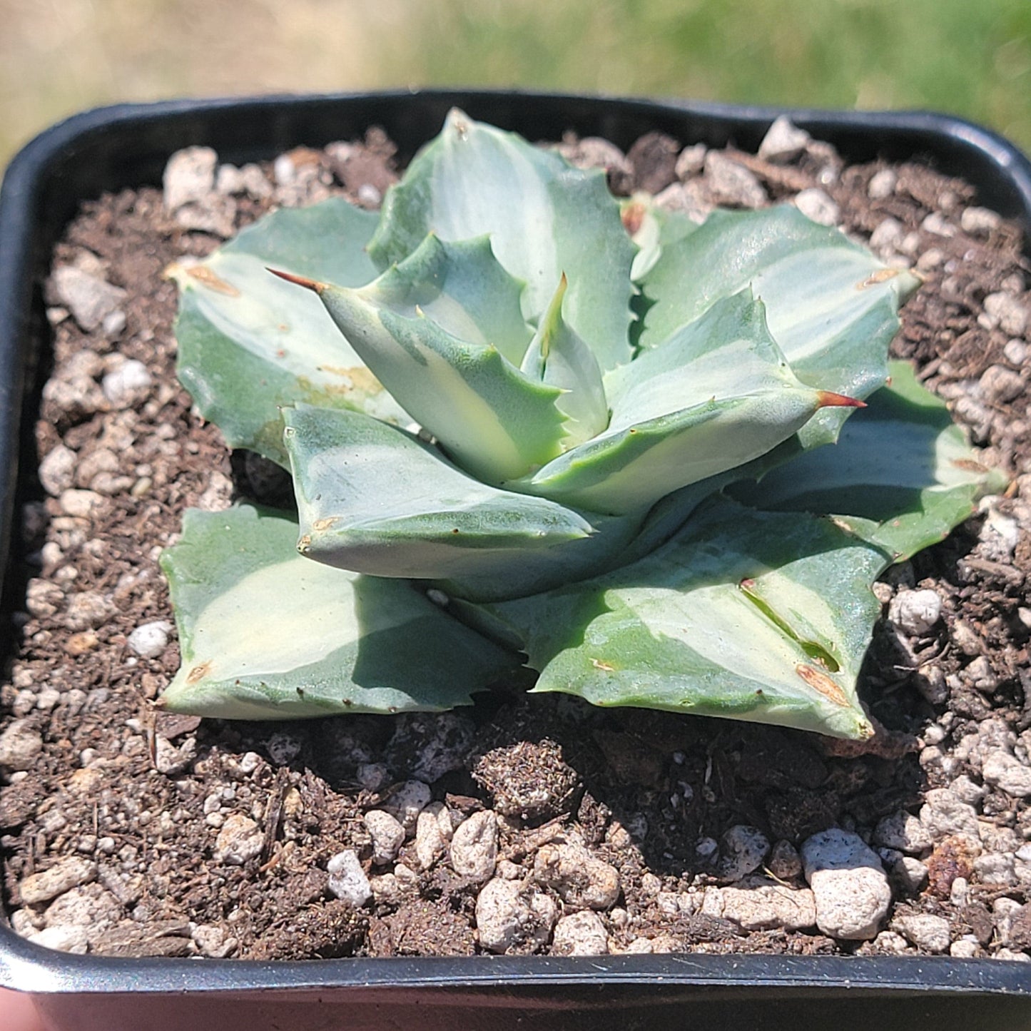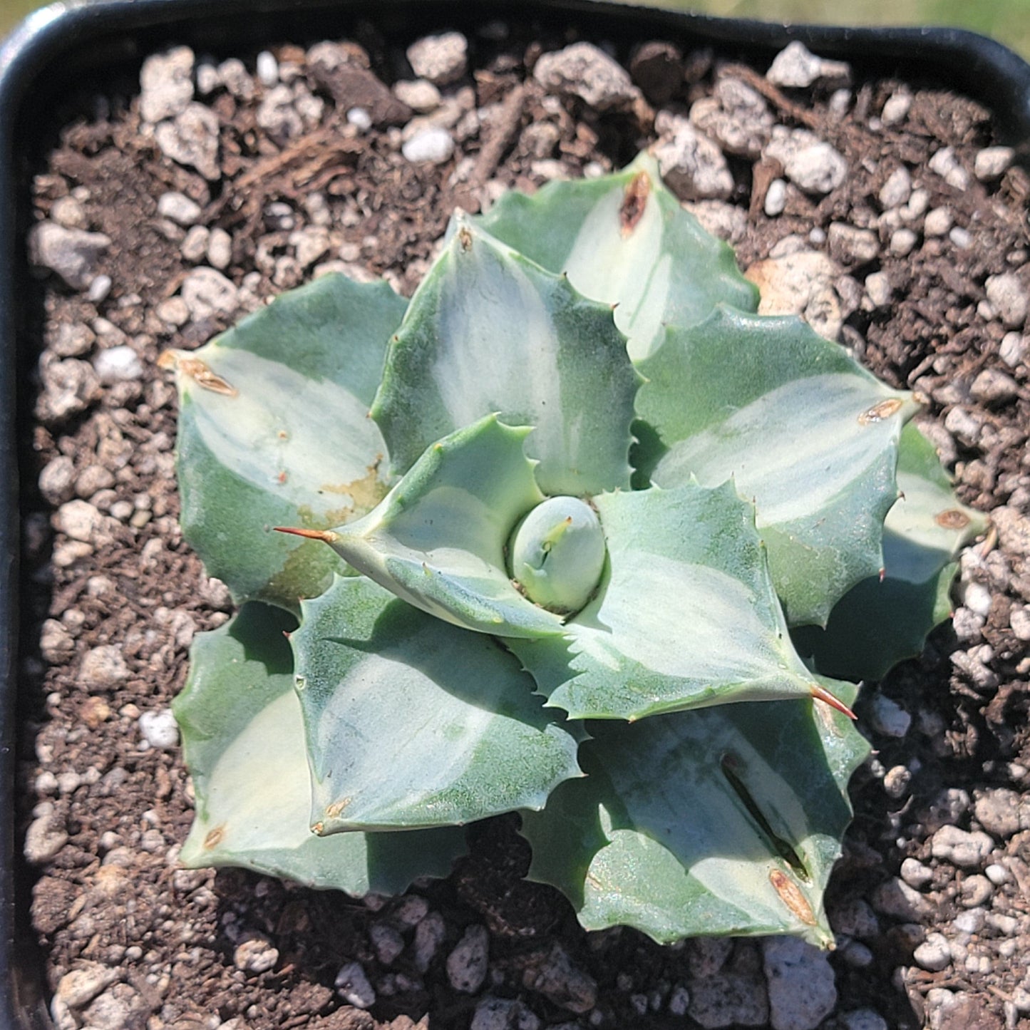 Agave isthmensis 'Dwarf Butterfly' is a compact and highly ornamental succulent cultivar known for its symmetrical rosette of broad, blue-gray leaves with pronounced margins edged in creamy yellow and tipped with small, sharp spines. This striking variegated variety gets its name from the rosette’s resemblance to butterfly wings, especially as the plant matures and the foliage forms dense clusters. Native to Mexico, Agave isthmensis 'Dwarf Butterfly' Var. is a slow-growing, drought-tolerant species that prefers full sun to partial shade and well-draining soil. Its small size, typically reaching only 6 to 12 inches in diameter, makes it perfect for containers, rock gardens, or as an accent in xeriscapes. Both beautiful and low maintenance, this agave is a favorite among collectors and succulent enthusiasts.