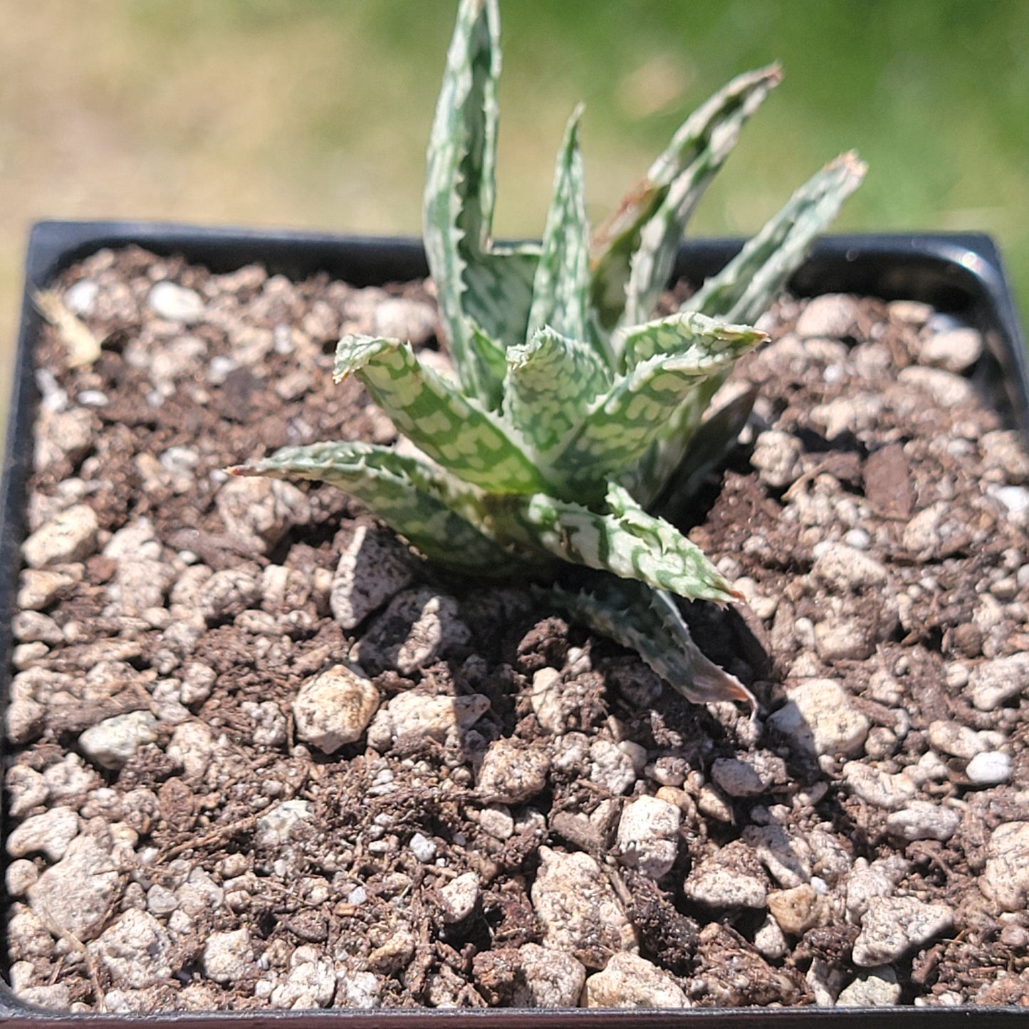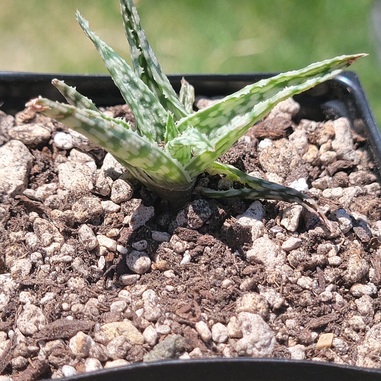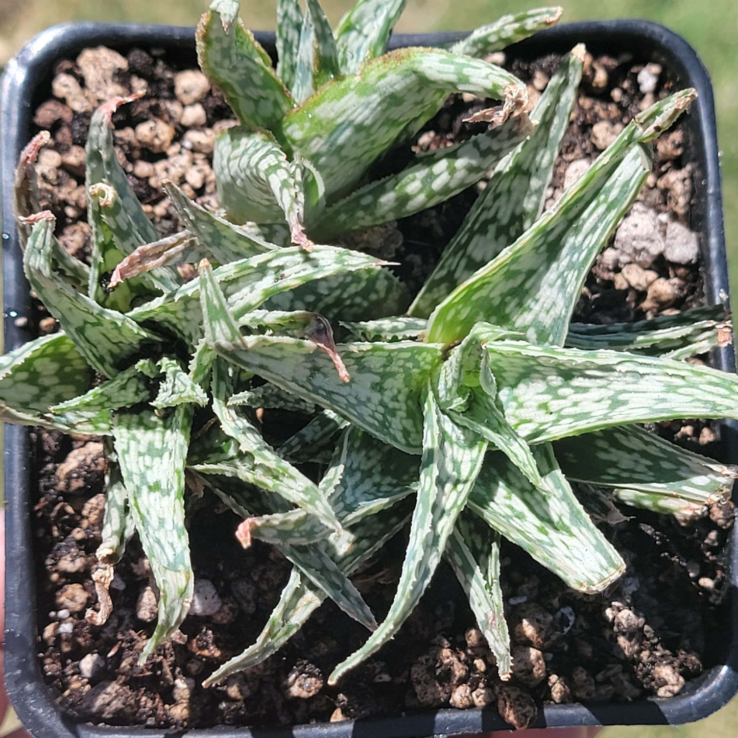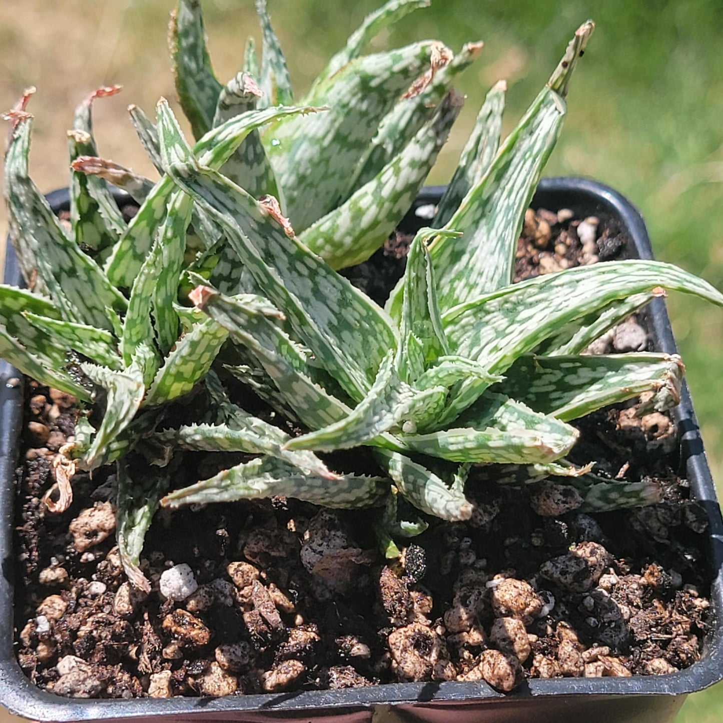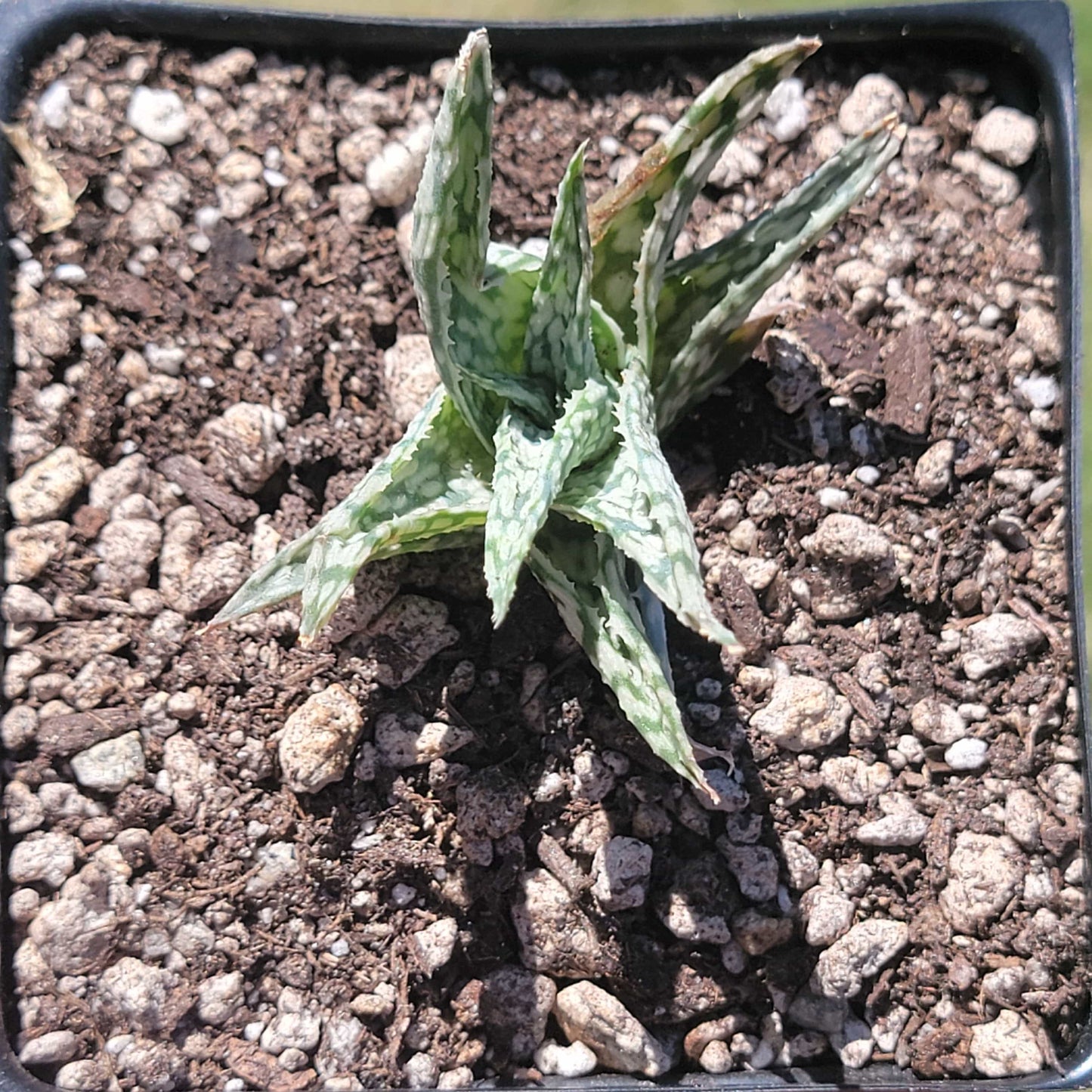 This succulent, Aloe 'Blizzard', is a unique dwarf plant with rosettes of upright pale green leaves adorned with numerous white markings, resulting in a nearly white appearance. The rosettes can reach a height of 8 inches (20 cm) and a diameter of 6 inches (15 cm). Throughout late winter and spring, coral bell-shaped flowers typically hang from a tall stalk.