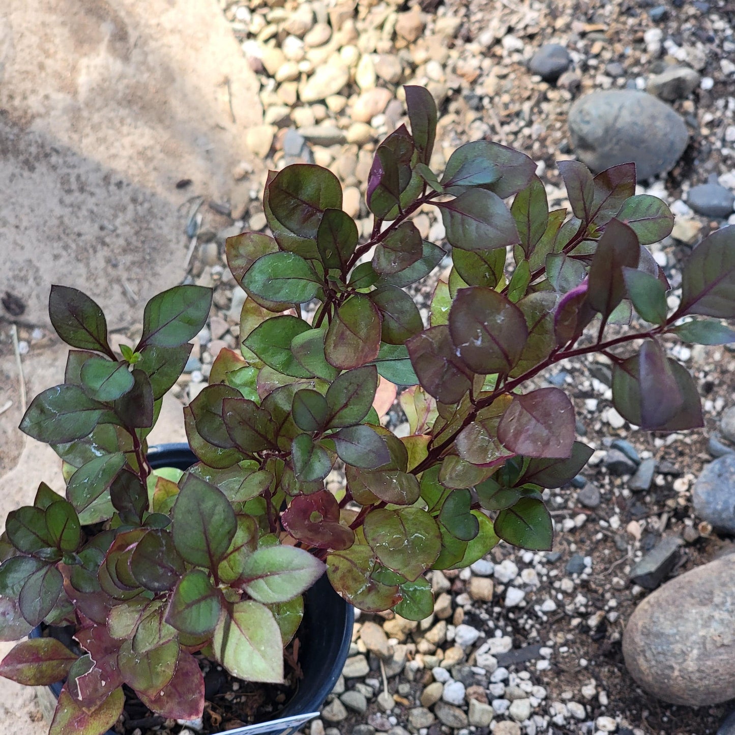 Alternanthera Hybrid 'Choco Chili', commonly known as Joseph's Coat, is a striking ornamental plant that features vibrant foliage with an intense mix of deep red, purple, and green hues, making it a standout in any garden or container. The plant's leaves are smooth and oval-shaped, with rich chocolate-brown centers that gradually transition to fiery red and green edges, creating a dramatic color contrast. 'Choco Chili' grows as a low, spreading ground cover or a compact shrub, reaching up to 12 inches in height, and it thrives in full sun to partial shade. Throughout the warmer months, it may produce small, inconspicuous white flowers, but its real beauty lies in its colorful foliage. Known for its heat tolerance and low-maintenance care, Alternanthera Hybrid 'Choco Chili' adds bold color and texture to landscapes, making it a popular choice for borders, hanging baskets, and mixed containers.