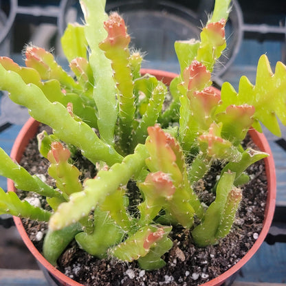 Epiphyllum anguliger 'Fishbone' is an exceptional cactus that sets itself apart from the typical desert cacti. Originating from Mexico, this tropical and epiphytic plant is ideal for those who struggle to maintain traditional cacti. Its distinctive, toothed stems are its most eye-catching feature, earning it various names such as zig zag cactus, ricrac cactus, and orchid cactus. With its ability to thrive in indirect sunlight and humid environments, this cactus is best displayed in a hanging pot or planter to fully appreciate its stunning foliage.