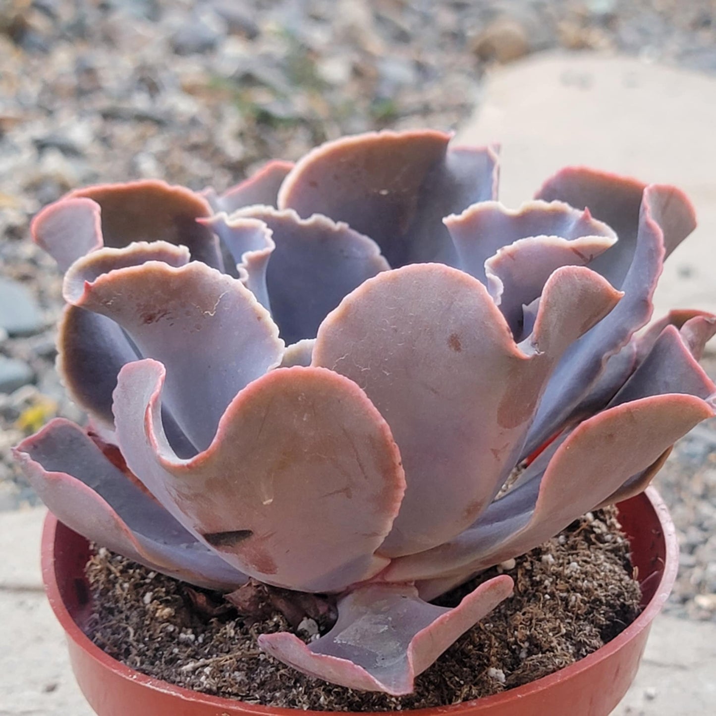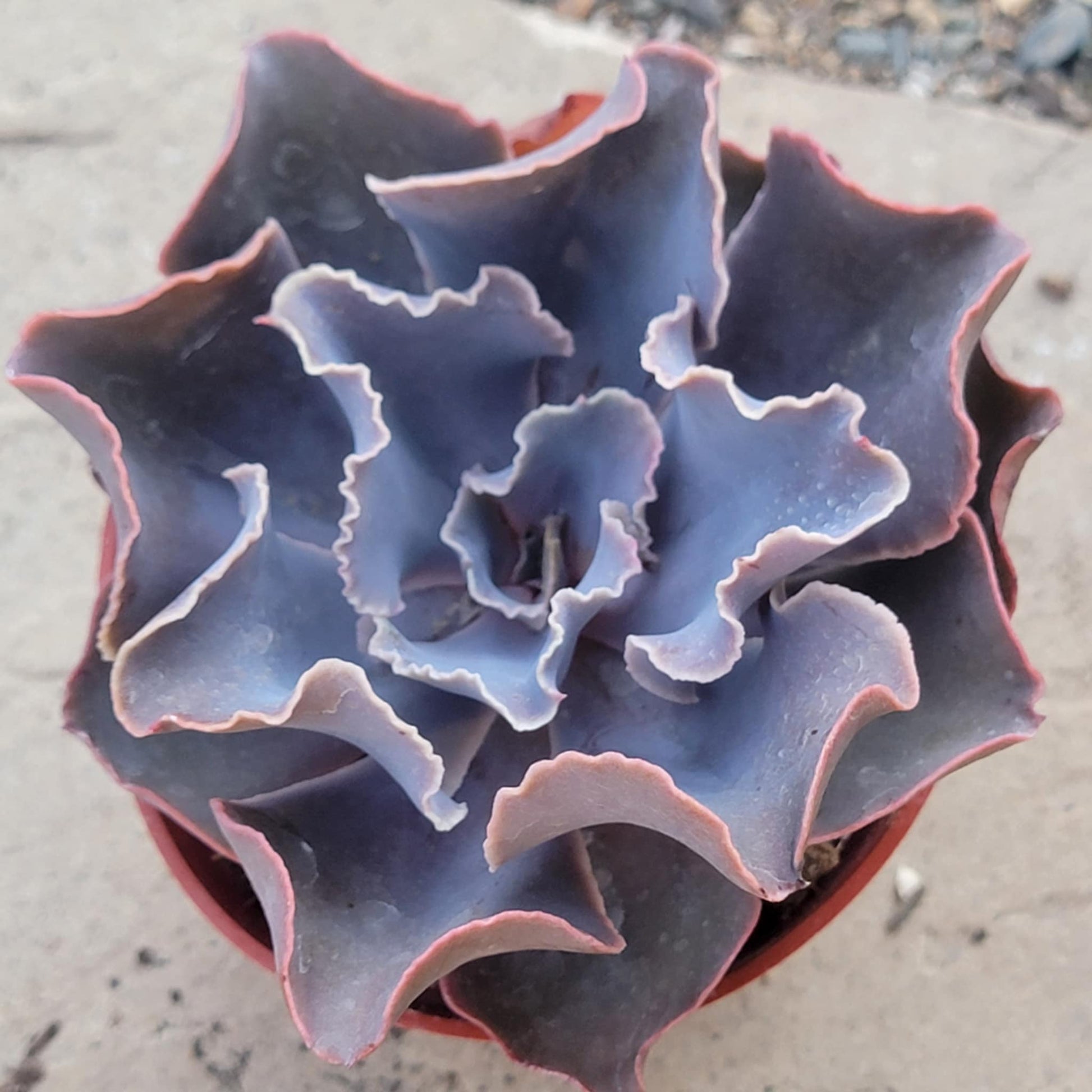 The Echeveria 'Purple Ruffles' is a show-stopping succulent known for its beautifully frilled, wavy leaves in rich shades of lavender, purple, and dusty pink. Forming large, open rosettes, this variety adds a dramatic and colorful flair to any succulent arrangement or garden bed. The ruffled edges often deepen in color with increased sunlight, giving the plant a vibrant, ornamental quality. In ideal conditions, it may produce tall flower stalks with small, bell-shaped blooms in warm tones. Like most echeverias, the Echeveria 'Purple Ruffles' prefers bright light, well-draining soil, and minimal watering, making it both a low-maintenance and visually striking addition to any plant collection.