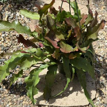 Epiphyllum anguliger ‘Fire’ — commonly known as the Ric Rac Cactus or Zig Zag Cactus 'Fire' — is a striking epiphytic cactus prized for its dramatic, deeply lobed stems that resemble a fishbone or zigzag pattern. The ‘Fire’ variety stands out with its potential to produce stunning, fiery-hued blooms in shades of orange, red, or coral, typically opening at night and releasing a sweet fragrance. Native to the tropical rainforests of Mexico, this cactus thrives in bright, indirect light and appreciates a humid environment with well-draining soil. Unlike desert cacti, Epiphyllum anguliger 'Fire' prefers regular watering during the growing season, while still needing to dry out slightly between waterings. Its unusual form, vibrant flowers, and ease of care make it a standout houseplant or hanging basket specimen, especially for those seeking something exotic and eye-catching.