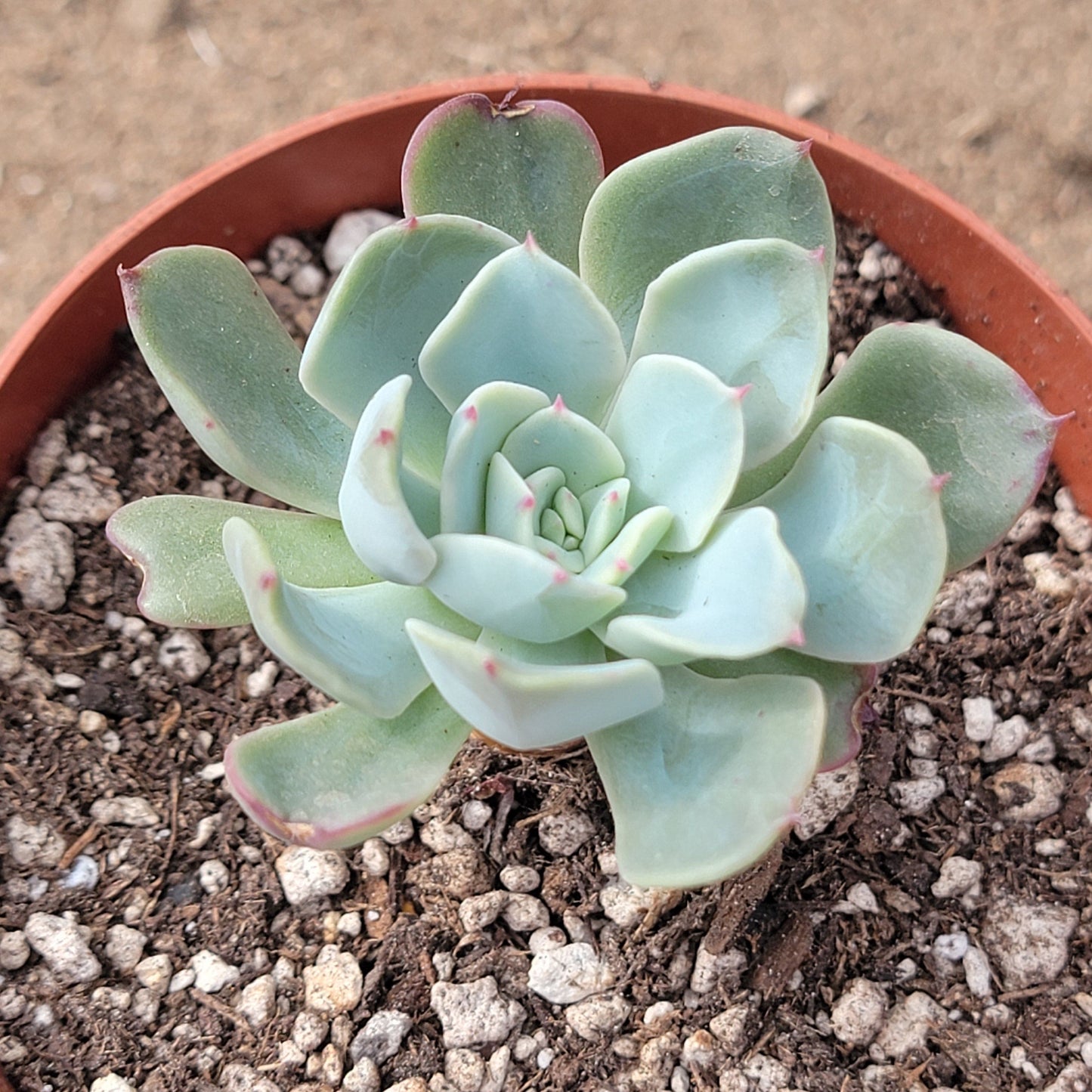 Echeveria 'Galaxy Blue' is a captivating succulent that stands out with its large, symmetrical rosettes of silvery-blue leaves. The plant's foliage has a soft, powdery coating that gives it a frosty appearance, and the leaves have a slightly curved shape, forming a beautiful spiral. As it matures, Echeveria 'Galaxy Blue' develops a striking, dense rosette that can reach several inches in diameter, making it a showstopper in succulent arrangements or garden beds. In the spring, it may produce tall flower stalks with bright orange or yellow blooms, adding a pop of color to its cool-toned leaves. This echeveria variety thrives in well-draining soil and requires minimal watering, making it an excellent choice for dry gardens or container planting. It enjoys full sun and, with proper care, remains a low-maintenance, stunning addition to any succulent collection.