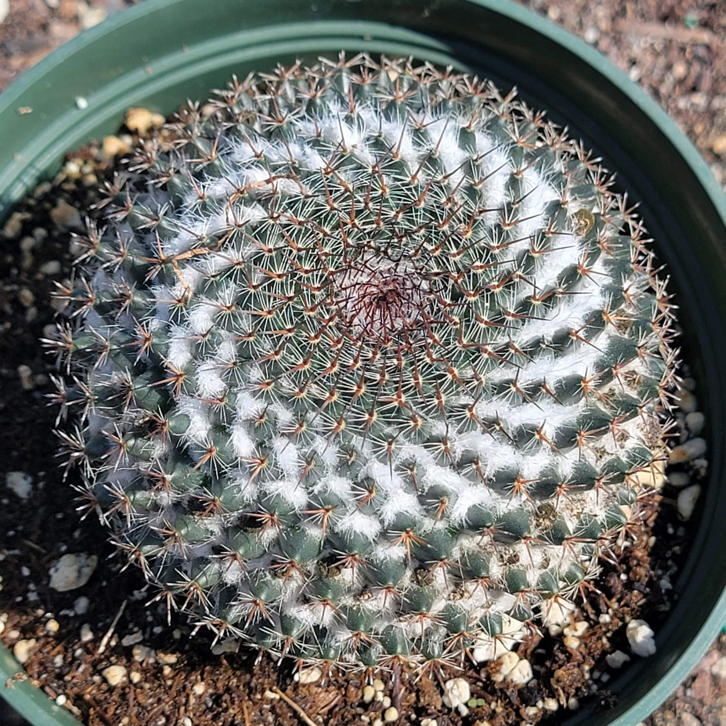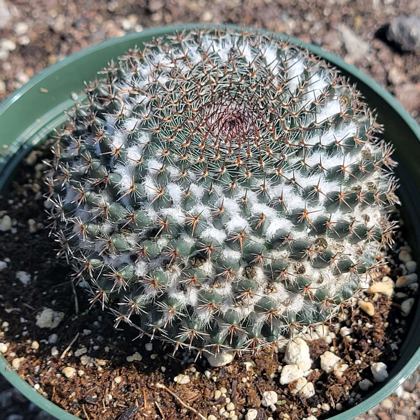 Mammillaria sempervivi (de Candolle): A flattened, globose cactus with a bumpy, spiky appearance. The stem is an olive green and has pyramidal bumps or "tubercles" covering its surface. In between the bumps is white wool. Its flowering is characterized by a crown of white to cream flowers on top of the stem. This type is native to Mexico and typically measures 4.0" in diameter or less.