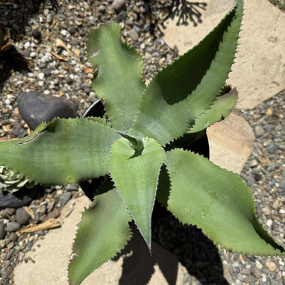 Mangave 'Blue Wave' is a stunning succulent hybrid known for its broad, gracefully undulating leaves in a cool blue-green hue. The rosette forms a wide, flowing silhouette that mimics the motion of ocean waves, giving the plant a dynamic and sculptural presence. The foliage often features a dusting of silvery bloom and faint burgundy speckling, especially when grown in bright light. This Mangave combines the structural strength of Agave with the softer, faster-growing qualities of Manfreda, making it both resilient and ornamental. 'Blue Wave' thrives in full sun to partial shade, prefers well-draining soil, and is ideal for container gardening or as a standout feature in drought-tolerant landscapes.