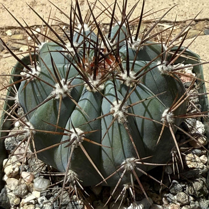 Melocactus azureus is a stunning and distinctive cactus species native to the limestone-rich soils of Bahia, Brazil. It is easily recognized by its striking blue-gray body, which is ribbed and covered in short, bristly spines that contrast beautifully with its unique cephalium—a dense, woolly structure of red to orange bristles that forms at the top of mature plants. This cephalium produces small, bright pink to magenta flowers and eventually fruit, marking the plant’s transition into maturity. Unlike most cacti, Melocactus azureus stops growing taller once the cephalium forms, focusing its energy on reproduction. It requires warm temperatures, excellent drainage, and minimal watering—especially in winter—as it is sensitive to cold and overwatering. With its exotic appearance and specialized growth habits, it’s a prized and challenging addition for experienced cactus collectors.