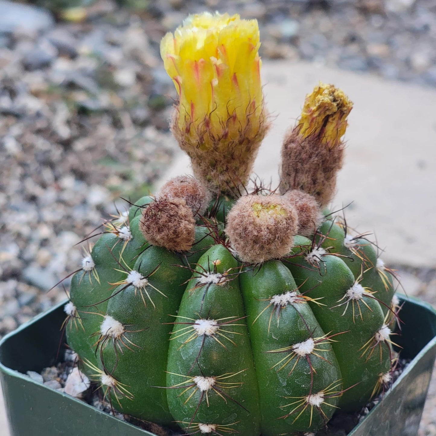 The Notocactus militaris, also known as Parodia scopa subsp. militaris or Parodia ottonis, is a small, globular cactus prized for its dense covering of golden-yellow spines and bright, cheerful flowers. Typically growing in a spherical or slightly cylindrical shape, this cactus stays compact, making it perfect for small containers or rock gardens. During the flowering season, it produces vibrant yellow to orange blooms that contrast beautifully with its spiny body. Hardy and relatively easy to care for, the Notocactus militaris prefers full sun to partial shade, well-draining soil, and infrequent watering—especially in winter when it goes dormant. Its unique texture and vivid flowers make it a standout addition to any cactus collection.